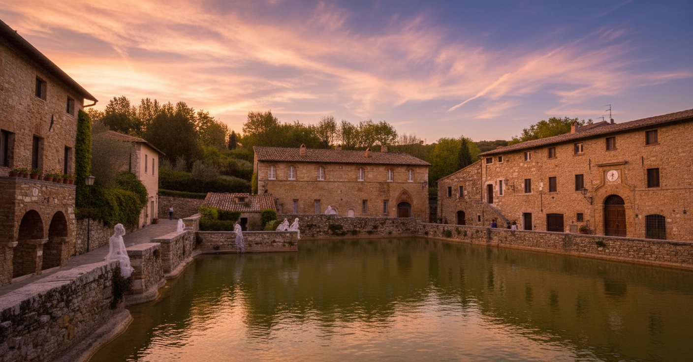 Borgo medievale tra i più belli della Val d'Orcia con il celebre Horti Leonini. A pochi chilometri, Bagno Vignoni con la sua piazza-vasca termale di origine romana dove l'acqua sgorga a 52°C.
